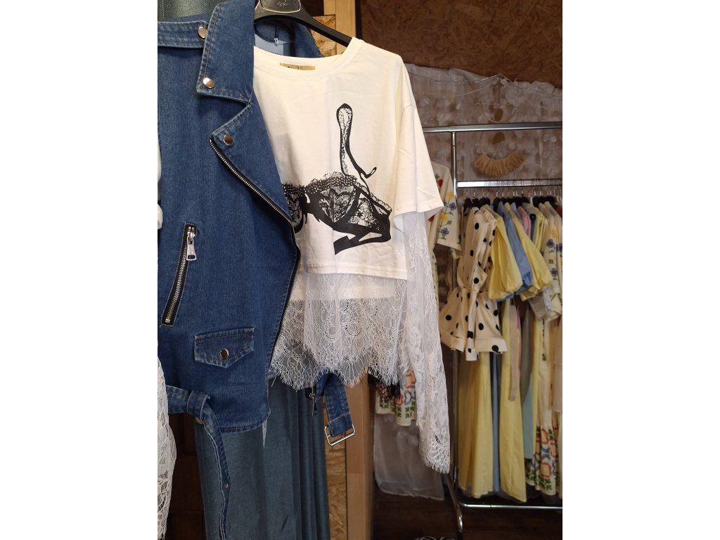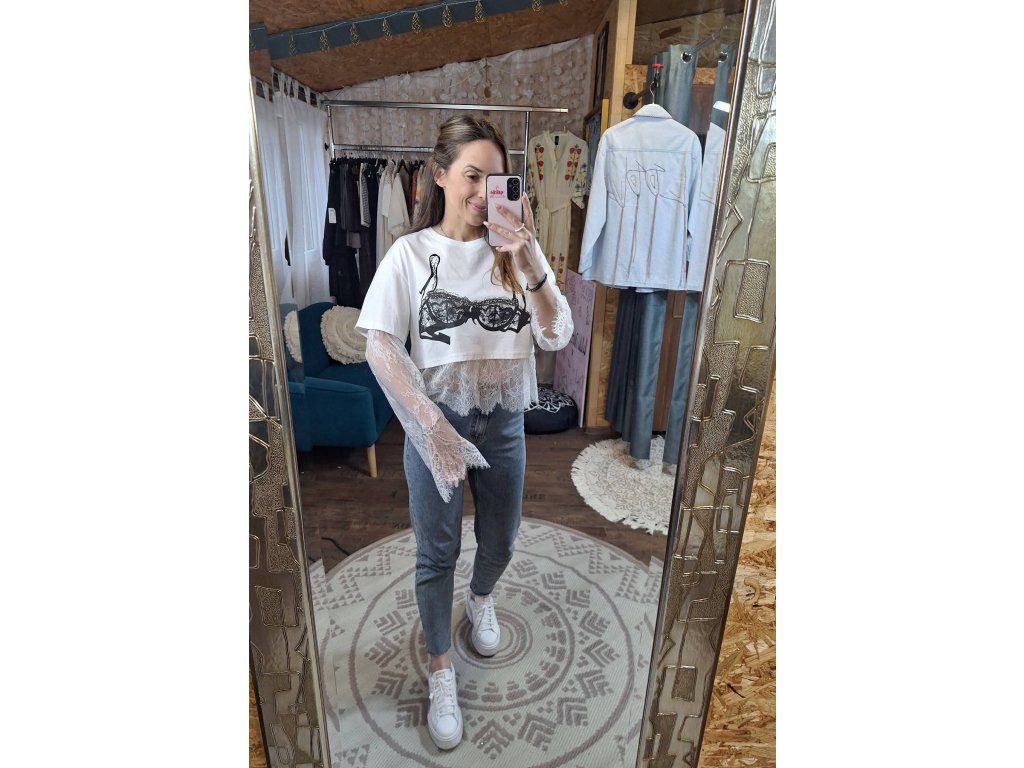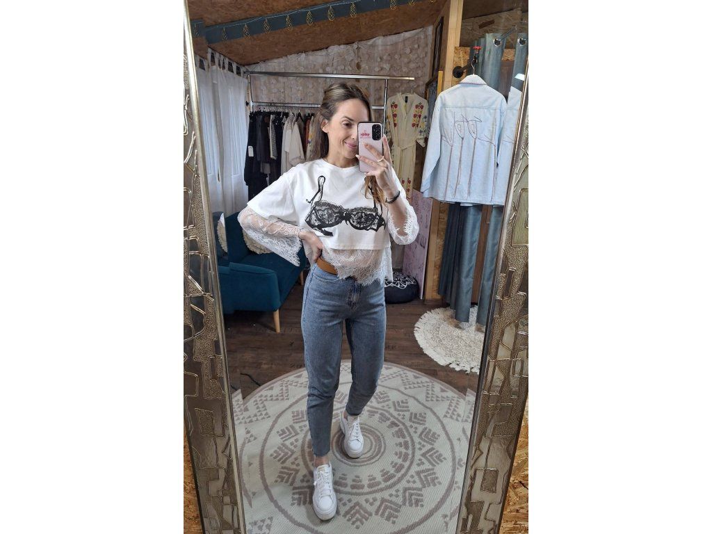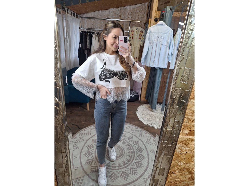 Top v bílé s černým potiskem a kamínky